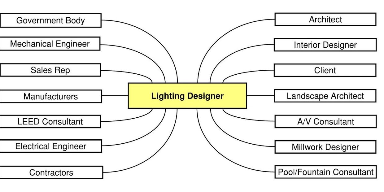 Others we work with during the design phase would be the mechanical engineer to coordinate fixture placement with HVAC equipment; the millwork contractor for lighting in cabinets and cases; LEED and WELL consultants; and code officials. Throughout the course of the project are numerous conversations and meetings with manufacturers and lighting reps to obtain product information and review samples. Finally, add the electrical and general contractors and you have quite a list. The graphic below gives an overview of the professionals we encounter on projects:
